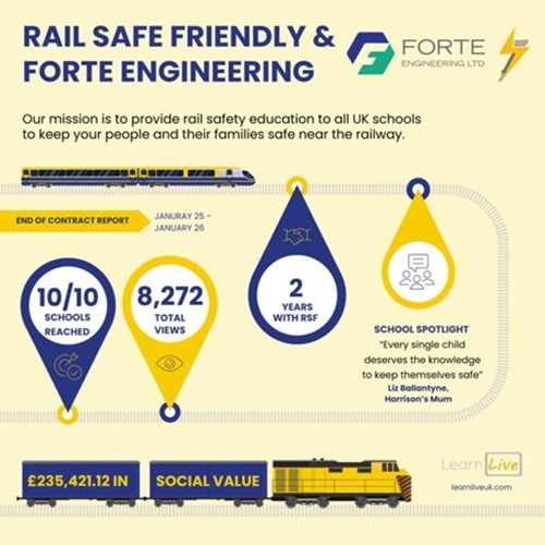 Stuart Heaton, Managing Director and Founder of Learn Live and Rail Safe Friendly commented: “It is fantastic to see the number of young people educated about rail safety, thanks to Forte Engineering's commitment and support. We are delighted that Forte Engineering is a proud supporter of the Rail Safe Friendly programme, demonstrating the rail industry’s collective commitment to making railway safety education accessible to young people across the country. With the support of organisations like Forte Engineering, we can continue our mission to protect young people from the dangers of railway trespass. Through their ongoing support, alongside the dedication of educators nationwide, Rail Safe Friendly continues to grow, delivering life-saving rail safety information directly into classrooms.”